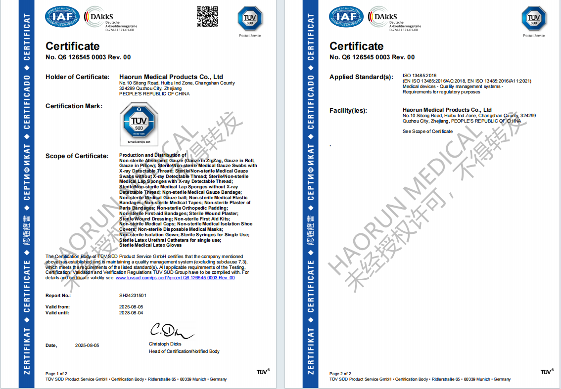 За да подобрим по-нататъшното качество, през септември 2023 г. завършихме публикуването на нашето качество на ръководството и документите за процедура. Въз основа на това подобрихме нашите документи за управление на качеството през януари 2024 г., добавяйки съдържание, свързано с MDR. Преминахме първия етап от одита на TUV SUD на 10 април 2025 г., а след това и вторият етап. И накрая, през август тази година номерът на сертификата ни стана достъпен за гледане в системата на нотифицирания орган, отбелязвайки нова стъпка напред в системата за управление на качеството на Haorun Medical и засилване на фондацията за развитие на компанията. Нашите медицински консумативи за еднократна употреба (марля, марля, преобръщане на марля и т.н.) осигуряват на клиентите по целия свят превъзходно качество и обслужване на продукта.